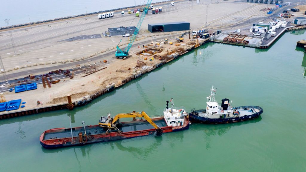 Arbejdet med det fjerde færgeleje skrider ifølge opdragsstillerne stille og roligt fremad på og omkring Trailerkajen hos Hirtshals Havn. I øjeblikket laves der bundsikring samt fundamenter til fendere og pullerter.