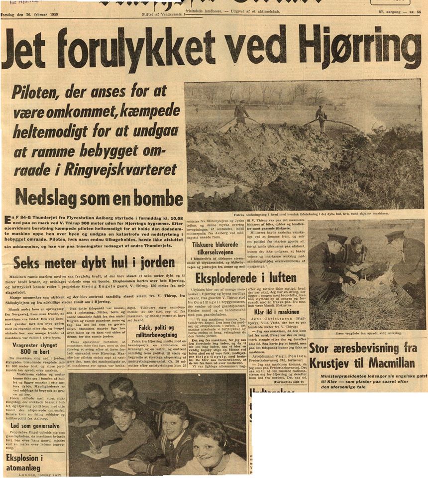 Under en flyveøvelse i februar 1959, mistede piloten af uvisse årsager kontrollen over flyet i luftrummet over Hjørring. Øjenvidner har berettet om, at flyet fløj meget lavt over byen, og at der havde været risiko for nedstyrtning omkring Nordre Skole, der lå på Norgesvej. Det lykkedes dog piloten at undgå nedstyrtning i bebyggede arealer, og han forulykkede derfor på en mark ved Vester Thirup lige øst for byen. Piloten omkom på stedet. ”I 1959 var det en begivenhed, der blev skrevet en del om i aviserne”, siger Morten Larsen.