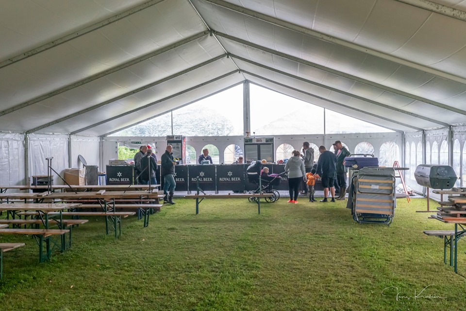I den ene anden af teltet blev der etableret en lang bar til de tørstige gæster, mens der i den anden ende er sat scene op til livemusik og ikke mindst strip. Imellem scenen og baren fylder bænke og borde teltet.