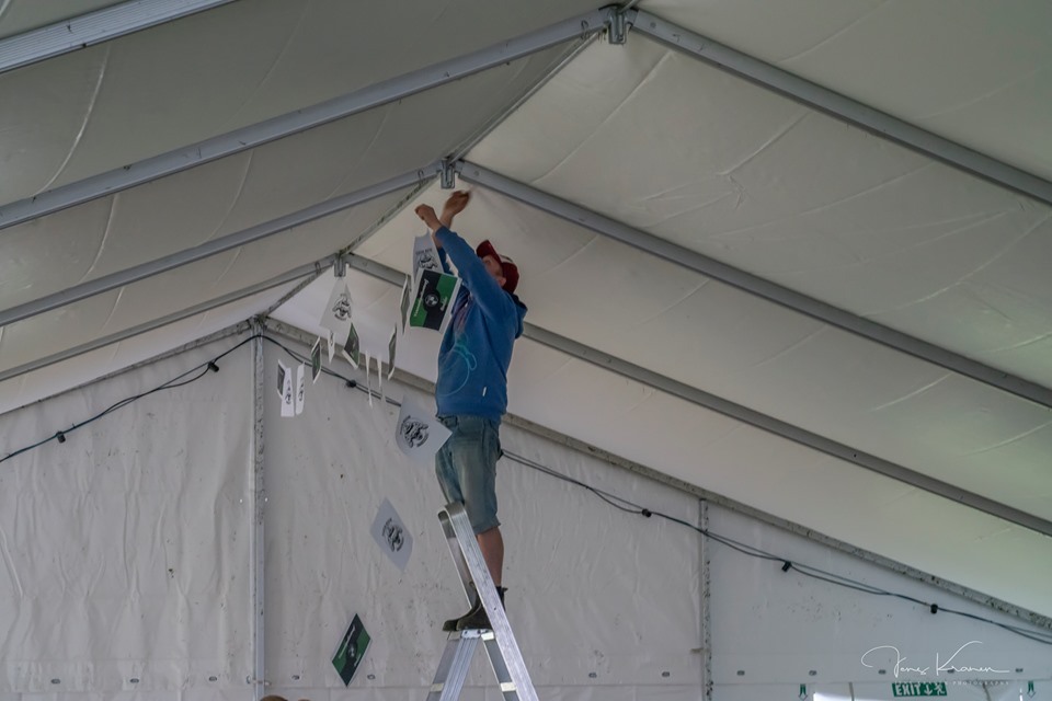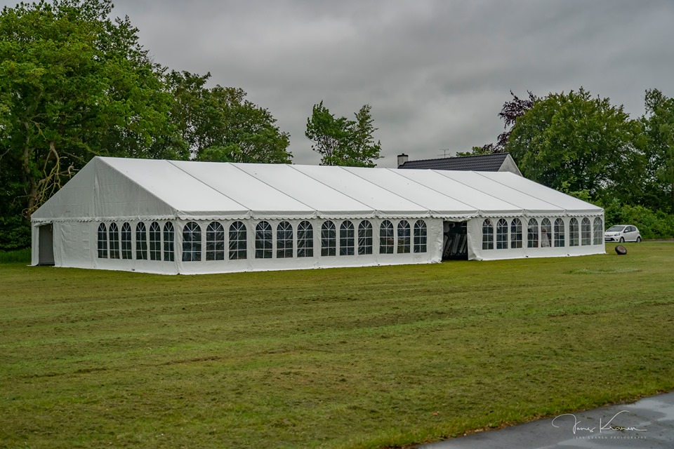 Puch Klubben i Bindslev har her til aften indrettet festteltet med det nødvendige inventar, så det står klar til weekendens Veteran Knallert Træf.