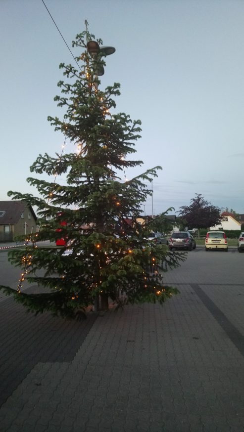 Juletræet på parkeringspladsen ved Dagl’Brugsen i Bindslev blev tændt kl. 22.22. Herefter blev de godt 100 tilskuer budt på et glas champagne og ønsket en god cykel jul.