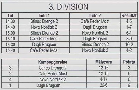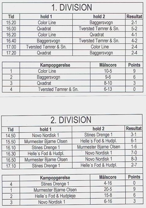 I 2. division gik 1. pladsen til et hold fra Murmester Bjarne Olsen i Sindal. Med en fin 2. plads til Helles Fod & Hudpleje. Endelig blev 3. division vundet overlegent af et hold fra Dagli’Brugsen i Bindslev.