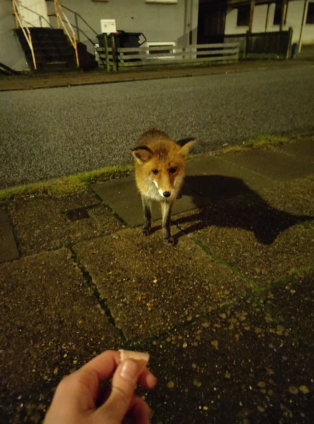 Lad nu være med at fodre vilde dyr selv om det er hyggeligt. Det kommer til at koste ræven livet når den næste den går hen til og tigger går i panik og vil den have den aflivet fordi den er farlig. En episode i Esbjerg hvor en ræv begyndte at gå i telte om natten fir at få mad endte også med at ræven pludselig skulle skydes fordi man blev bange for den. Vilde dyr, slet ikke rovdyr, skal ikke fodres. Nogle bliver farlige af det..Hold op med det..