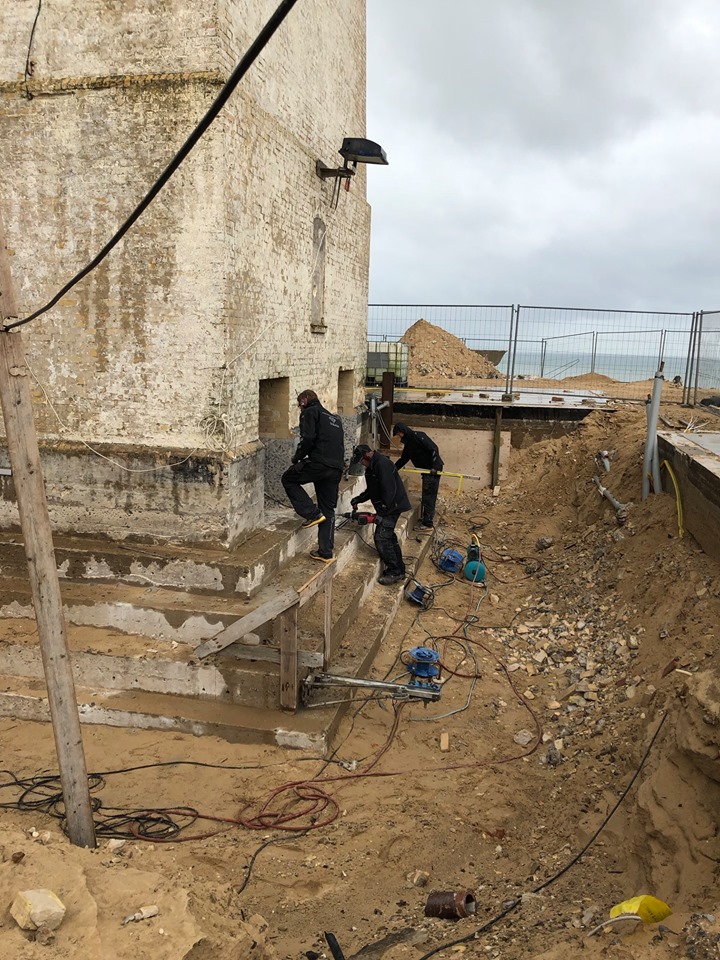 Fire huller er nu boret. De er lavet i det nederste murværk og øverste del af fundamentet, som står ovenpå det massive trappefundament. Denne del af fundamentet borer man ikke i, da det er dette, der er med til at stabilisere fyret.