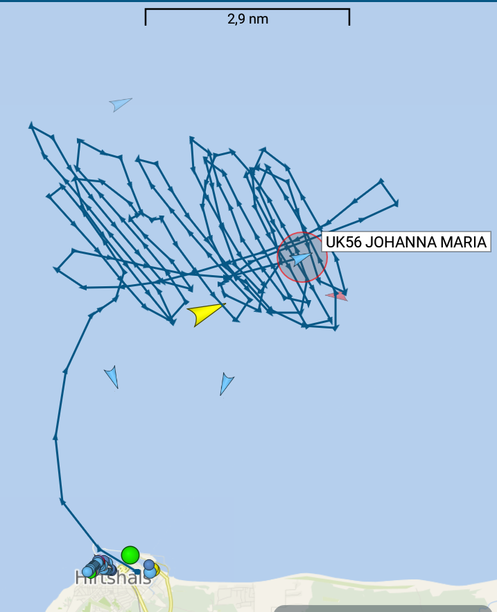 Danske kontrollanter lod onsdag en hollandsk bomtrawler fiske ulovligt. Billederne i dette opslag viser det hollandske fartøj “UK 56 Johanna Marias” position inden for 4-sømilegrænsen ved Hirtshals. Kontrolskibet “Vestkysten” befandt sig lige i nærheden i skjul, men tændte så sit AIS-satellitsignal. Dermed blev “Vestkysten” synlig (den røde trekant), og så vidste hollænderne, at der var kontrol i farvandet. Igen så danske myndigheder altså imellem fingre med EU’s destruktionen af miljø og fiskeri i Danmark.