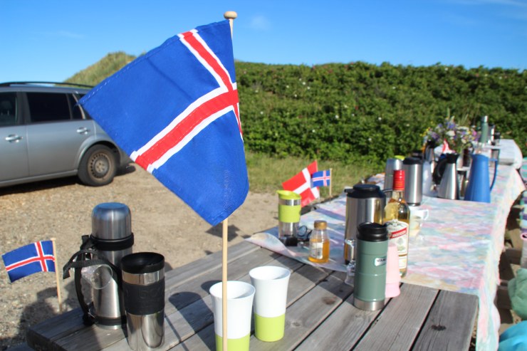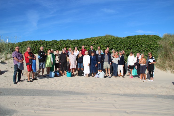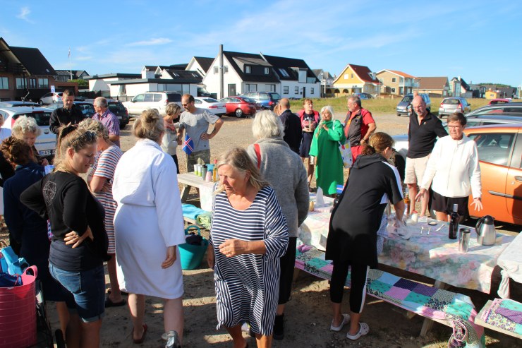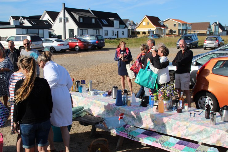 Før den fælles badning bliver et langt bord derfor pyntet med dug og flag på parkeringspladsen på hjørnet ved Kystvejen og Vestmolevej. Derefter bevæger den store flok sig samlet ned på stranden, hvor nogen smider al klunset, mens de fleste andre beholder lidt tekstil på kroppen, hvorefter alle ufortrødent løber ud og får sig en dukkert.