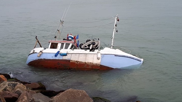 Fiskekutteren er delvis sunket og ligger fortsat på ydersiden af den østlige mole i Hirtshals Havn. Den forventes bjærget i løbet af onsdag.