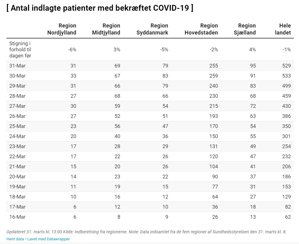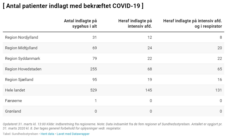 I alt ligger er nu 529 personer indlagt med COVID-19, og i hele landet er der konstateret 2.815 personer med COVID-19, hvoraf langt de fleste altså ikke kræver hospitalsindlæggelse.