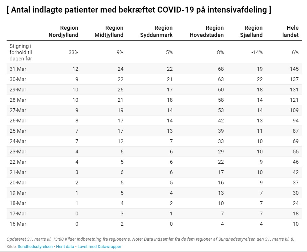 I forhold til i går er antallet af patienter, som er i kritisk tilstand og dermed indlagt på intensiv afdeling vokset fra 9 til 12 patienter. Det er en stigning på 33 procent, og det er den største stigning i hele landet.
