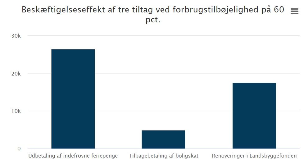 Som figuren viser, ville det give en beskæftigelseseffekt, der svarer til mindst 26.500 job, hvis man udbetaler de indefrosne feriepenge til danskerne. Kontanterne vil sætte gang i forbruget, der igen vil skabe beskæftigelse.