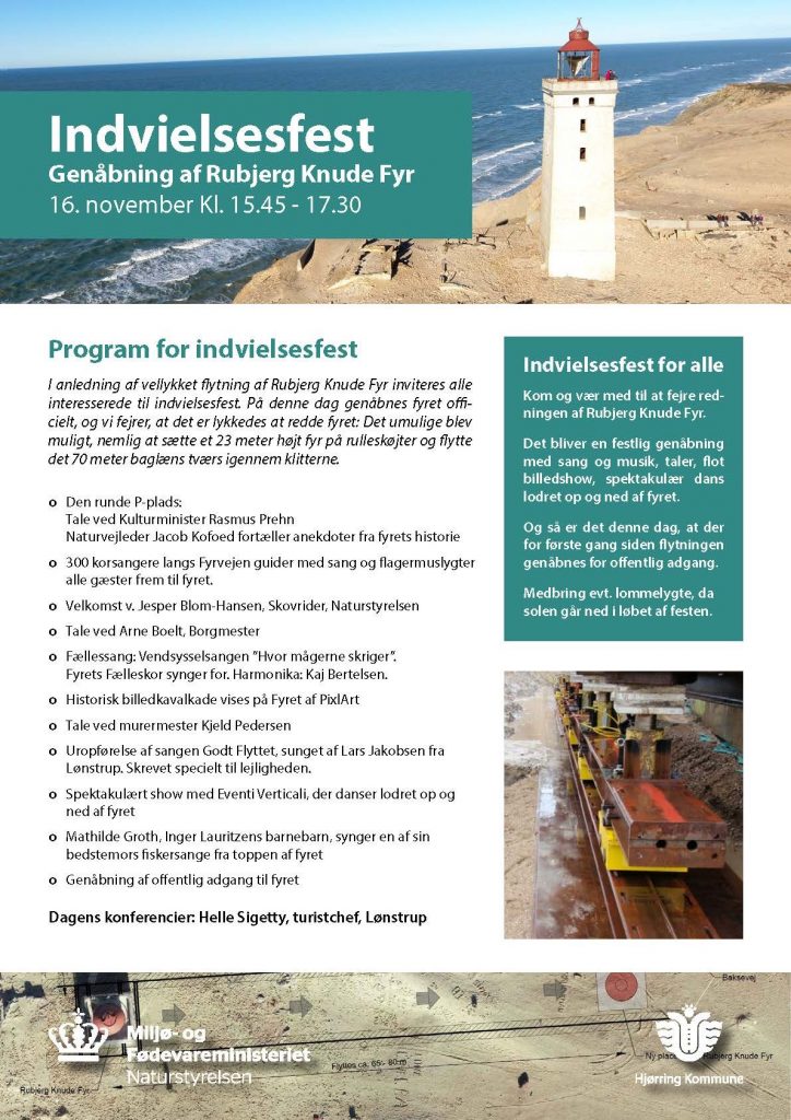 Sendingen begynder kl. 16.10. Her hos FlaskePosten følger vi derfor også begivenhederne ved Rubjerg Knude Fyr. Indvielsesfesten byder på officielle taler fra Hjørring Kommunes borgmester Arne Boelt, skovrider Jesper Blom Hansen fra Naturstyrelsen og murermester Kjeld Pedersen, som har stået for den store flytning af fyret.
