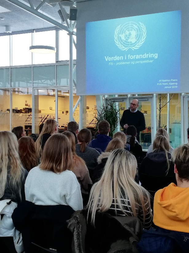 Eleverne har i disse uger et tema om international politik og udvikling, og i den forbindelse havde samfundsfagslærer Gert Aagaard Sørensen inviteret Hjørrings lokale folketingsmedlem Rasmus Prehn fra Socialdemokratiet, der selv har været delegeret ved FNs generalforsamling, til at holde oplæg.