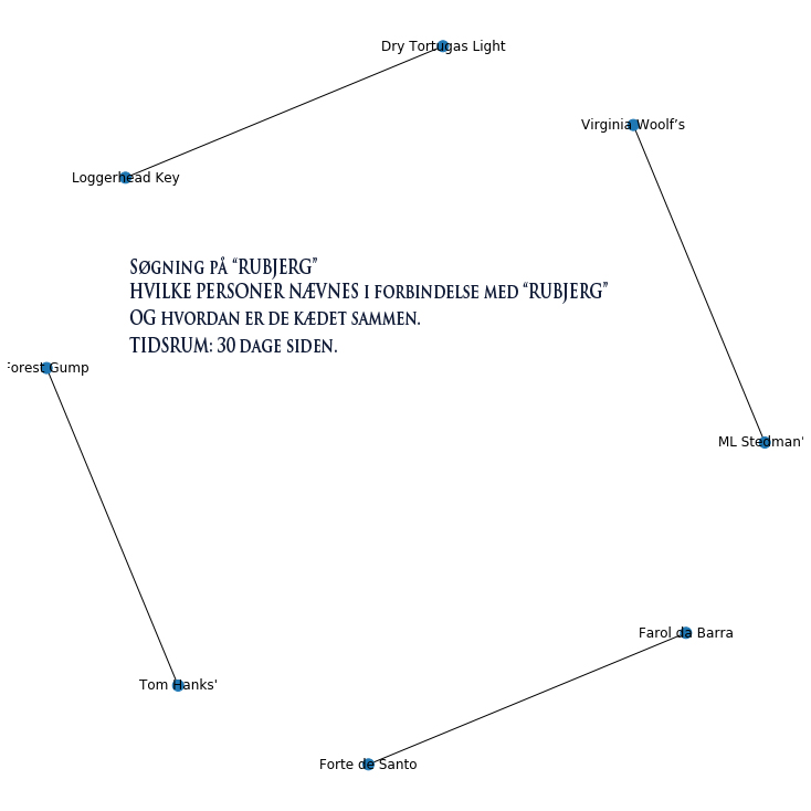 Der er ikke rigtigt et netværk af mennesker, som er connected på denne søgning, og det tætteste, som vi kommer noget meningsfuldt er, at Tom Hanks er connected to Forest Gump. Men det er vel også, hvad man kan forvente, når man søger på Rubjerg i alle de store globale medier (for en måned siden).