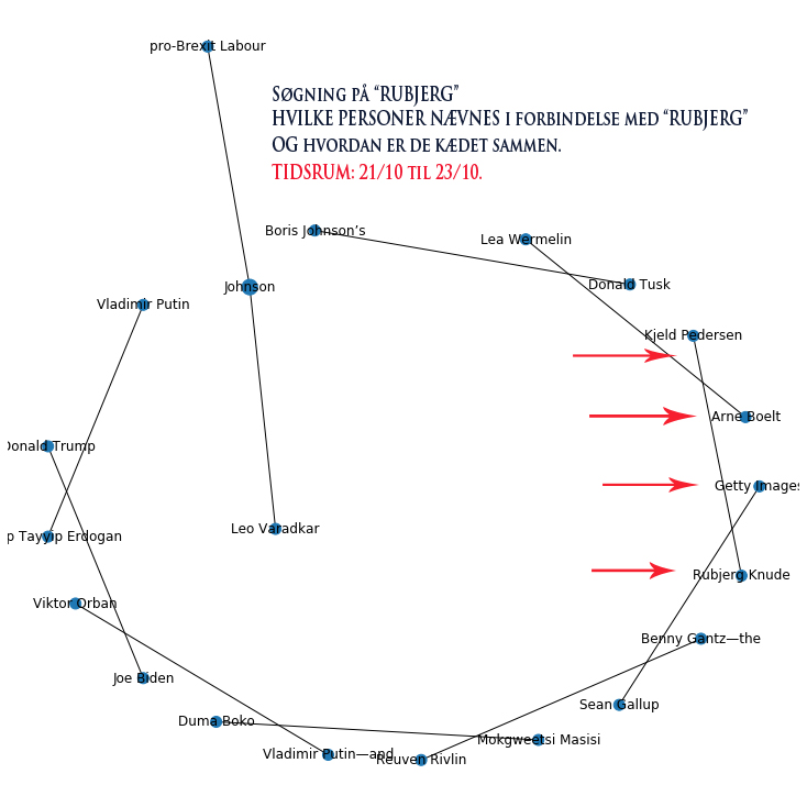 Jeg har adgang til at ”scrape” en stor andel af alle de globale digitale medier, og i den forbindelse lavede jeg en søgning på ”Rubjerg” i digitale artikler fra 20. til 30/9-2019. Resultatet ses i billede 1. Formålet med min algoritme er at sætte navne på søgetermet ”Rubjerg” og se hvordan disse navne er connected.