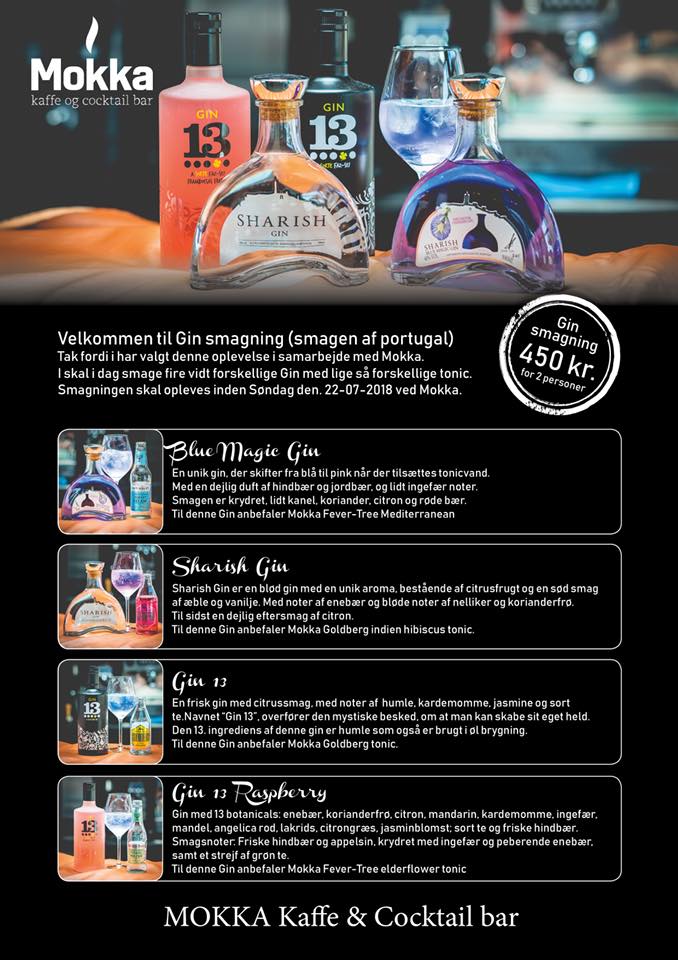 Smag fire helt unikke og forskellige gin med fire lige så forskellige tonic hos Jakob Nielsen på Mokka. Altså intet mindre end smagen af Portugal i Hirtshals. Prisen er 450 kr. for to personer. Kan købes på forhånd, men skal nydes inden udgangen af uge 29 ved Mokka. Tjek tilbuddet ud nedenfor.