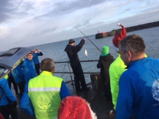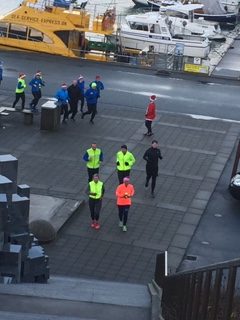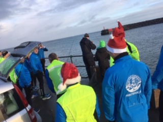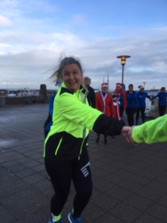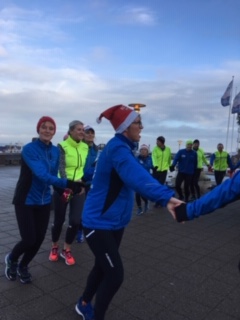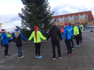 – Karl Erik Risager forklarede kort om ruten, hvorefter løberne kom igang. Turen gik forbi Hirtshals Fyr, derefter ned på Vesthavnen, helt ud på molen, op ad Trappen og hen at danse rundt om juletræet på Den Grønne Plads, fortæller Mette Trolle.