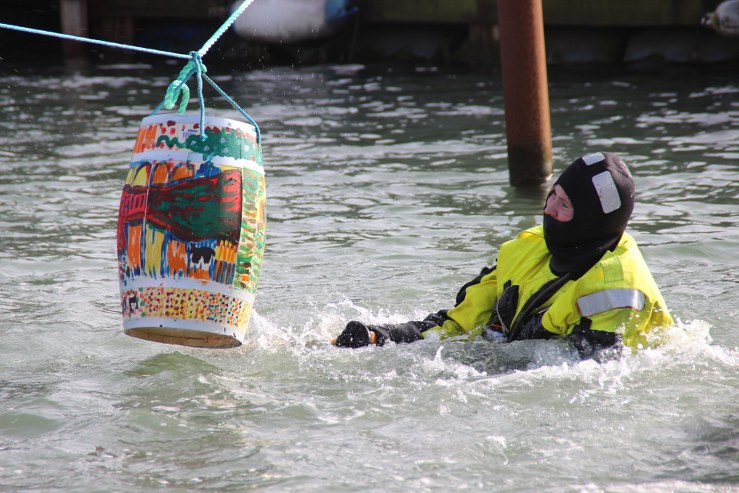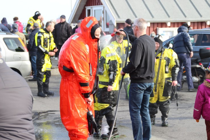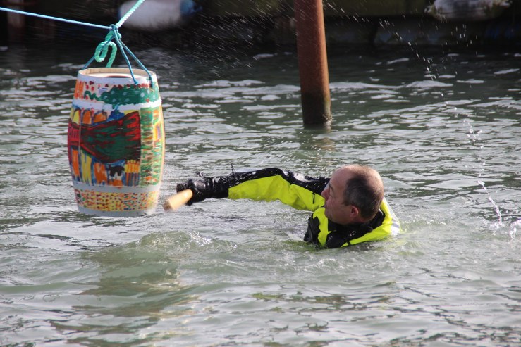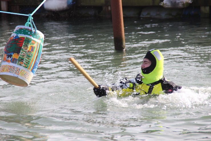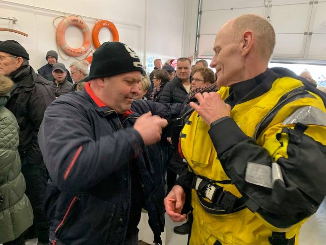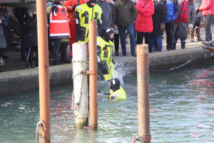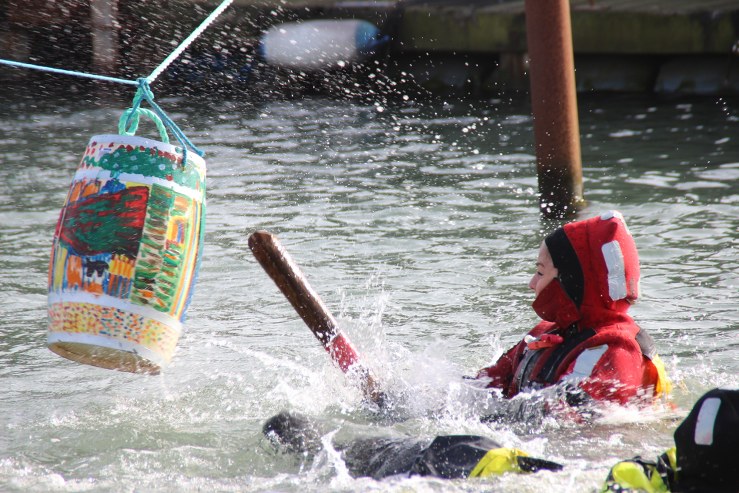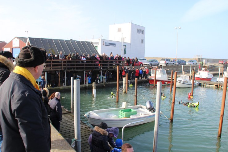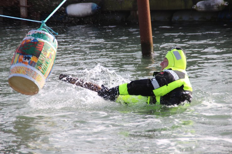 Fuld skrue fik fastelavnsfesten igen i år ved Redningsstationen, der lagde lokaler og redningsdragter til for enden af Nordvestkajen på Hirtshals Havn.Det lykkedes i hvert fald deltagerne i havnebassinet forbavsende hurtigt at få slået bunden ud af tønden, hvorefter alle kunne kaste sig over de eftertragtede flasker, der dermed dumpede i det salte vand.