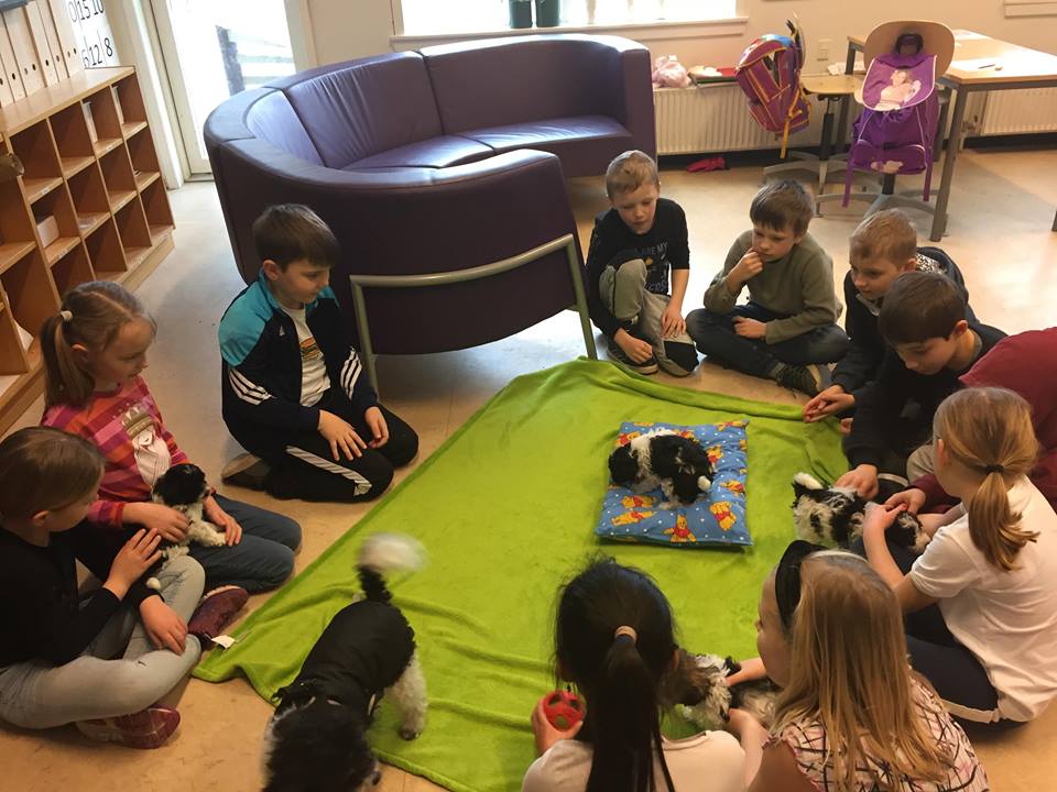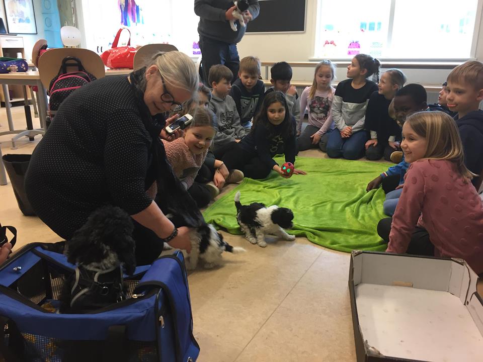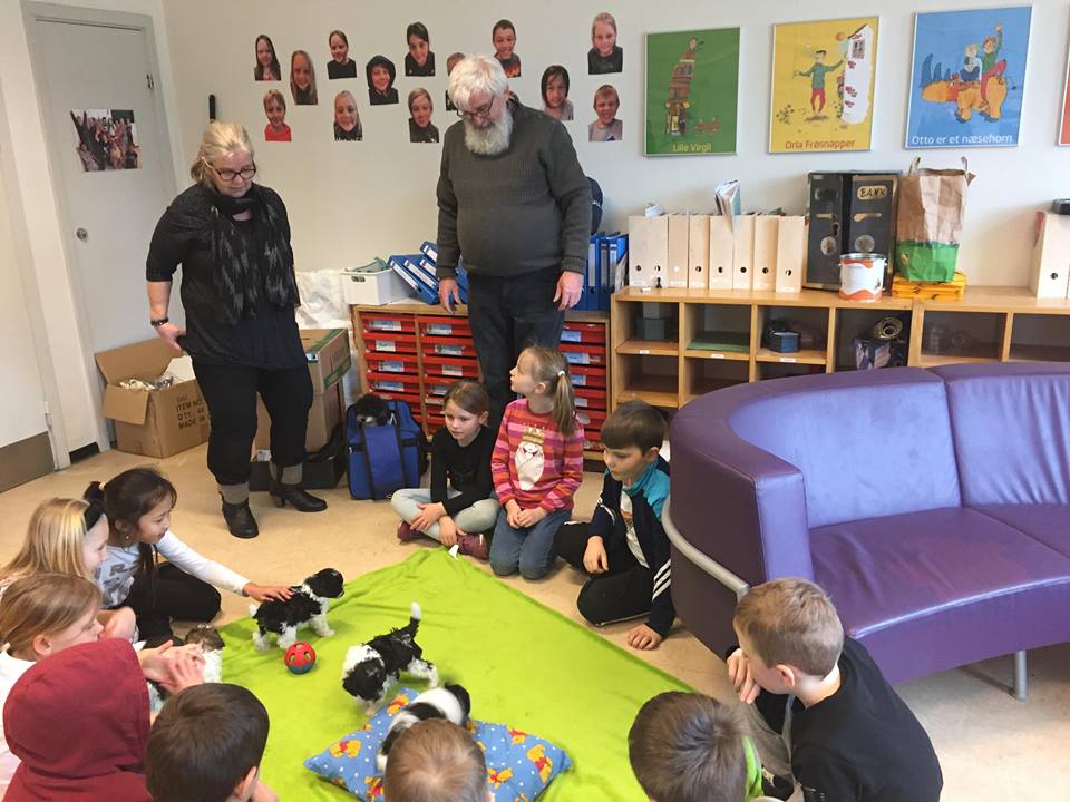 Læsehunden Stella og hendes hvalpe samt Rita Skjoldager og gemalen var torsdag på besøg hos eleverne i 2. årgang på Hirtshals Skole.