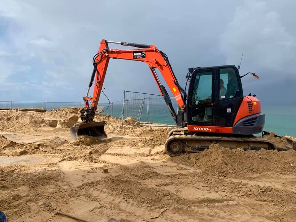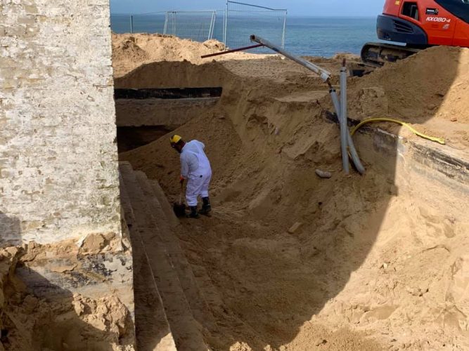 Denne mandag begyndte arbejdet så også med at grave selve fundamentet frit rundt om det stolte gamle fyr på toppen af klinten. Kjeld Pedersen fra Lønstrup Murerforretning tog oven i købet selv fat med skovlen ved Rubjerg Knude.