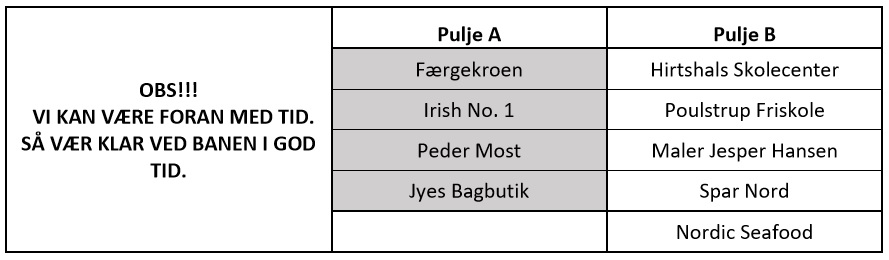 – Vi glæder os til at se jer alle, gode og såvel knap så gode spillere, til en lørdag med masser af god fodboldunderholdning, til fordel for ungdomsarbejdet i Hirtshals Boldklub, slutter arrangørerne hos Hirtshals Boldklub.