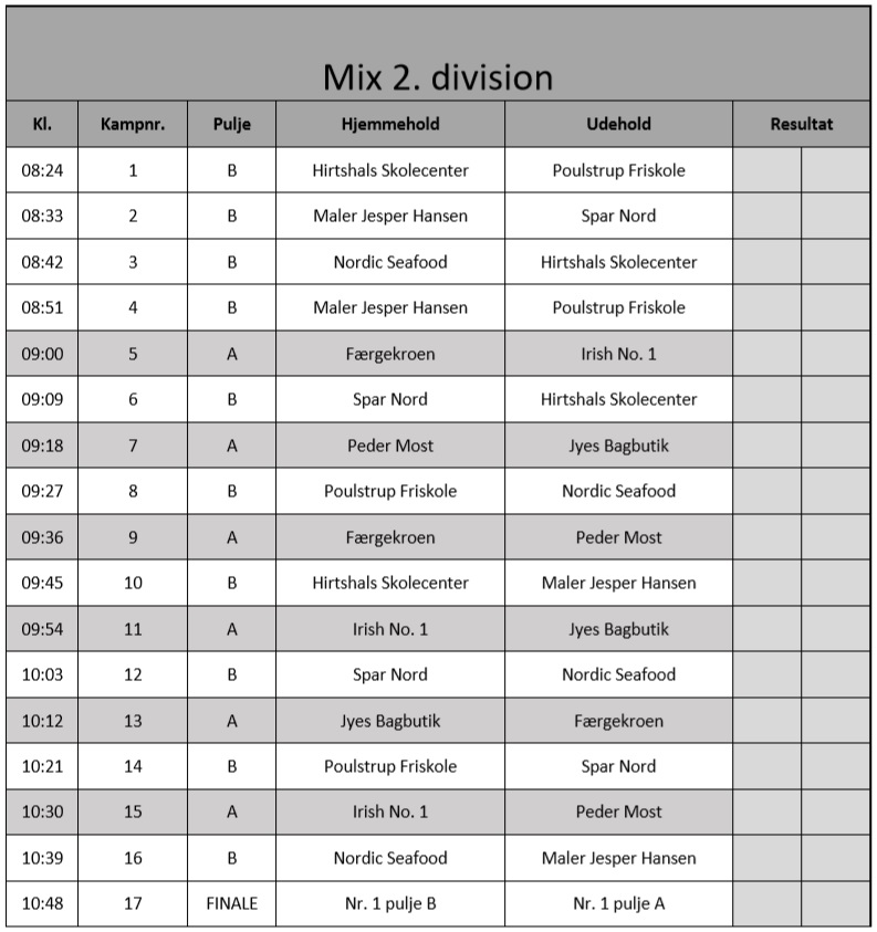 Hvis nogen mangler betaling inden stævnet, kan det nås endnu: Pris 850,- kr. pr. hold ved forudbetaling til Spar Nord, reg. 9067 konto 456-453-5740 eller MobilePay til 64800 900 kr. pr. hold ved betaling ifm. stævnet.