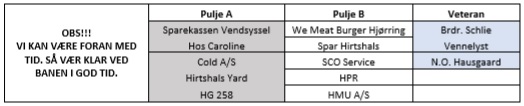 – Vi modtager gerne spurtpræmier ved dommerbordet, hvis I har lyst til at medbringe noget. Spurtpræmier gør det en lille tand sjovere, lyder det fra arrangørerne, som er Kurt ”Nisvis” Christensen, Jesper ”P” Poulsen og Steffen Ledet.