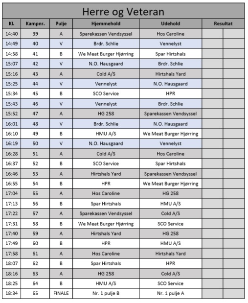 I veteran er der 3 hold i puljen, som er flettet ind i starten af herrerækken, hvor der er pokal til 1. pladsen. Husk at være spilleklar i god tid, da vi kan være og tit er 5 min. foran tiden i programmet.