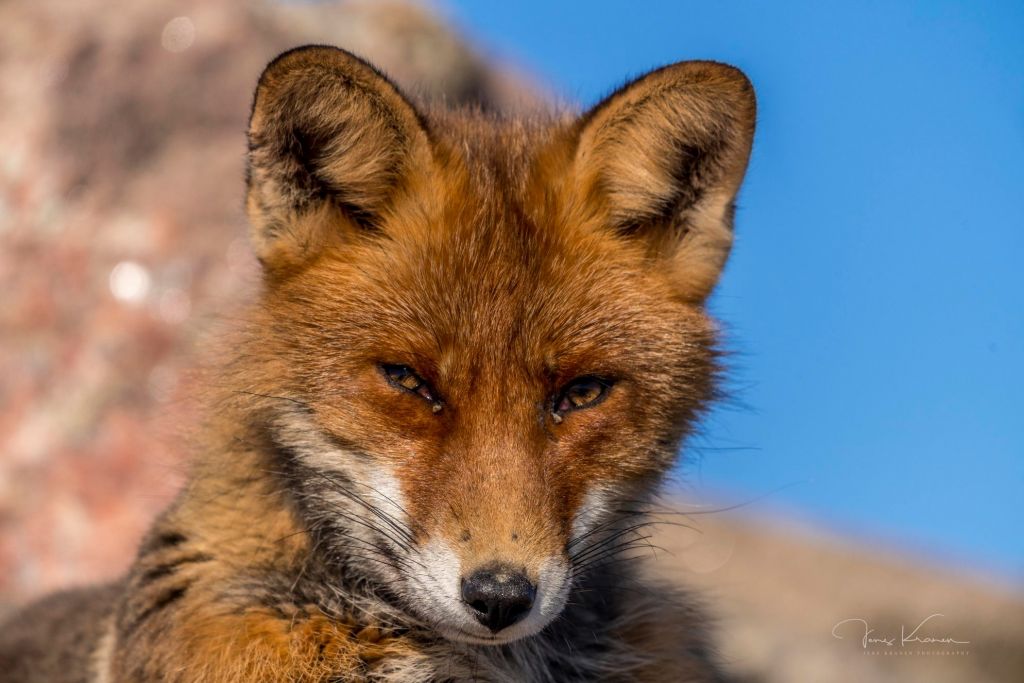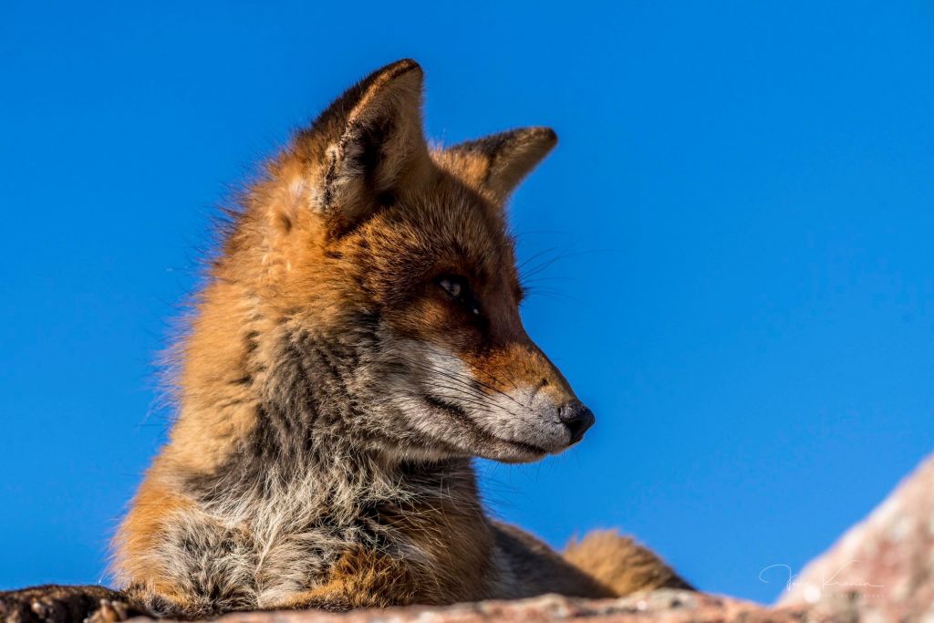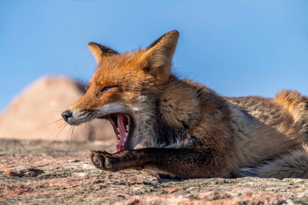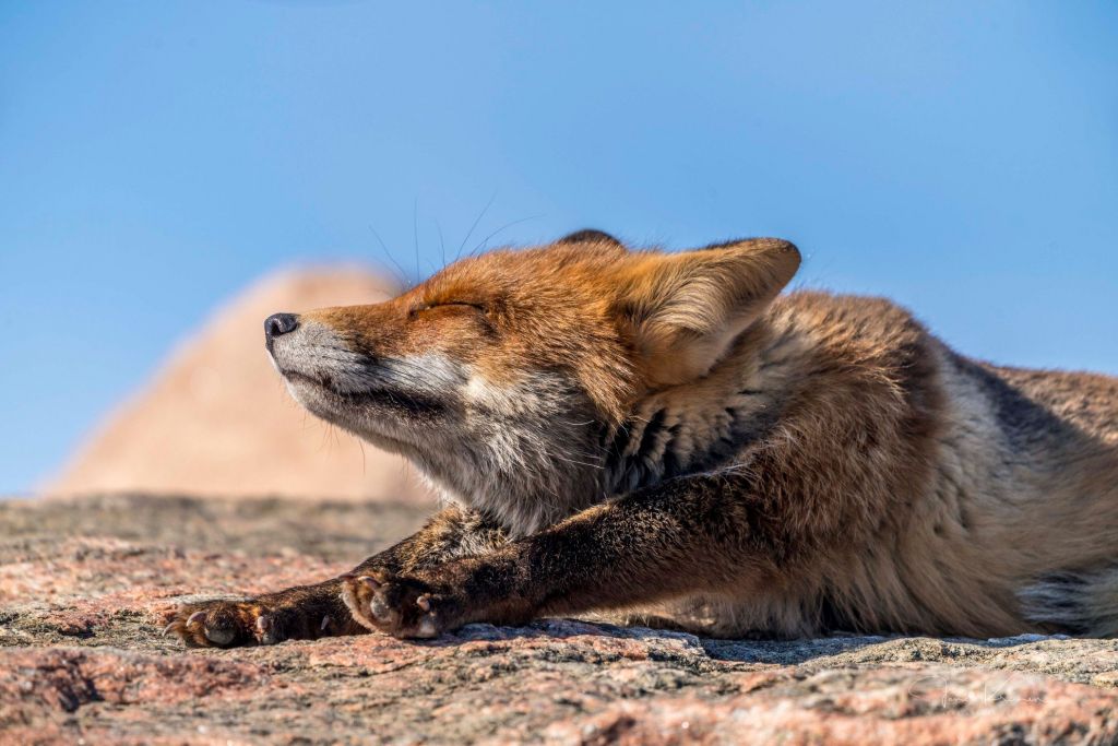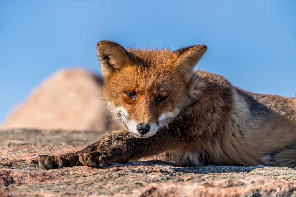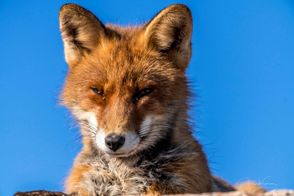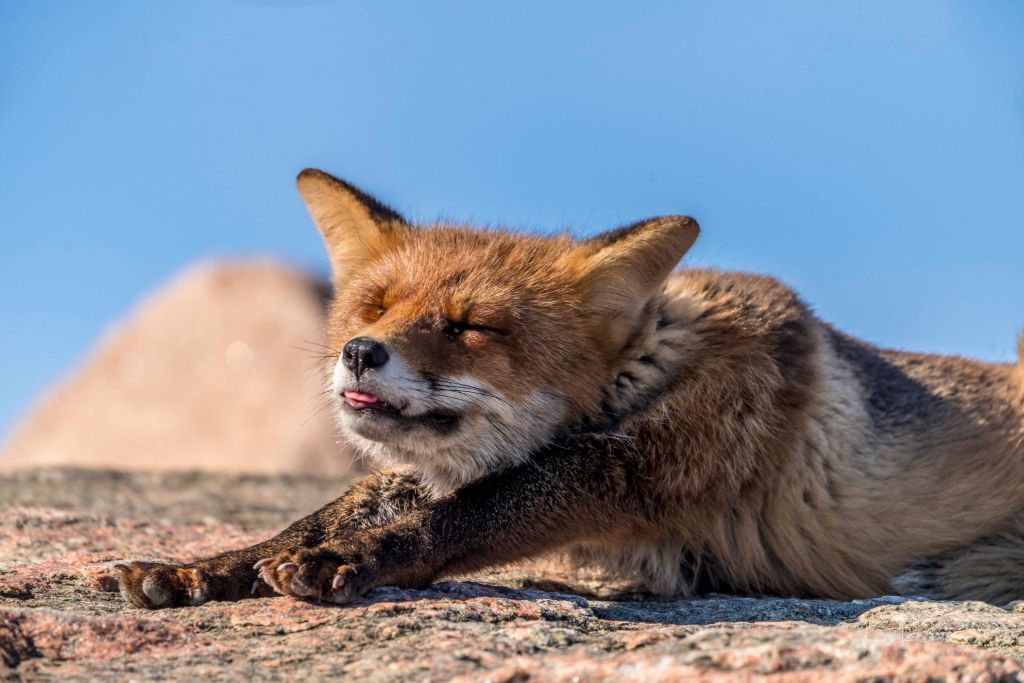 Mikkel Ræv nød lige som så mange andre det flotte vejr her i det nordvestlige Vendsyssel. Der blev gabt og strukket ud, før han til sidst poserede lidt på molen. Den blå grænse bevogtes kort fortalt ikke bare af politiet på Hirtshals Havn.