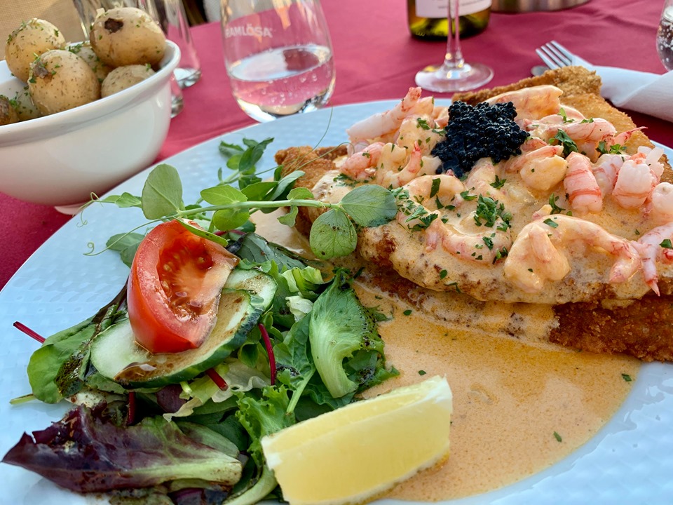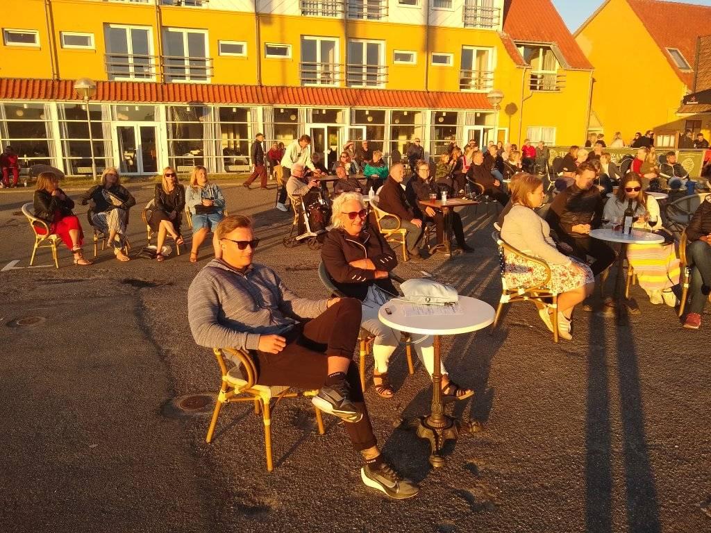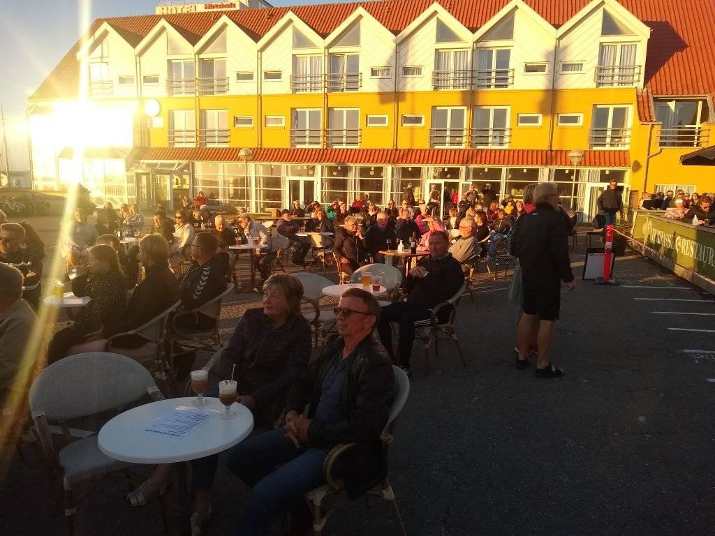 Mange havde allerede i god tid på kroens terasse nydt et måltid, som for nærværende skribent og frue bestod af en rigtig lækker fyldt rødspætte, før festen i lav aftensol blev åbnet med musikalsk manér af CW Band med Judith Østenfelt, Steen Engbjerg og Jan E. Østenfelt. Drikkevarer kunne ikke bare købes på kroen, men også i en vogn betjent af et par friske old boys fra Hirtshals Boldklub.