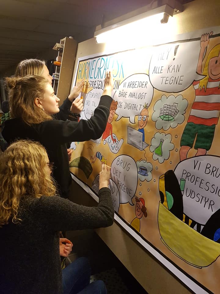 Skolen benyttede også lejligheden til at præsentere det nye linjefag horneGrafisk, som starter op til august 2019. I faget arbejder eleverne med, hvordan man forvandler ord til billeder, og de bytter de mange ordtunge slides ud med mindre skrift og mere tegning.