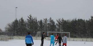 HMU har ryddet sne, så kunststofbanen er klar til fodbold og standerhejsning søndag hos Hirtshals Boldklub.