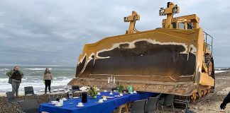 Søndag formiddag blev der drukket kaffe i vandkanten på Thorup Strand, inden bord og kaffestel blev smadret for at sætte fokus på bomtrawlere.