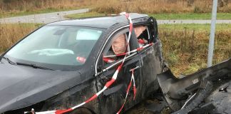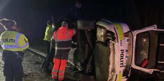 En politipatrulje fra Nordjylland Politi kørte lørdag aften ved 21-tiden galt på motorvej E39 syd for Hjørring. Bilen endte på taget og de to i bilen er kørt til Regionshospitalet i Hjørring lettere tilskadekomne.