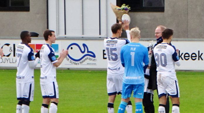 Andreas Kaltoft fik før kampen blomster og hyldest af sportsdirektør Glen Riddersholm og udråbt som efterårets spiller i Vendsyssel FF.